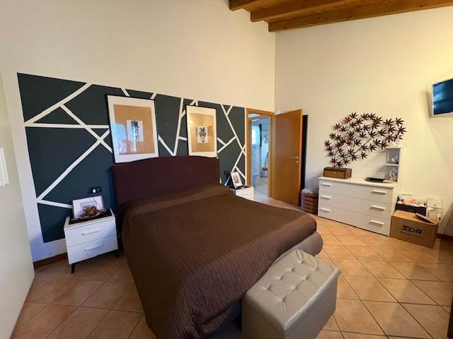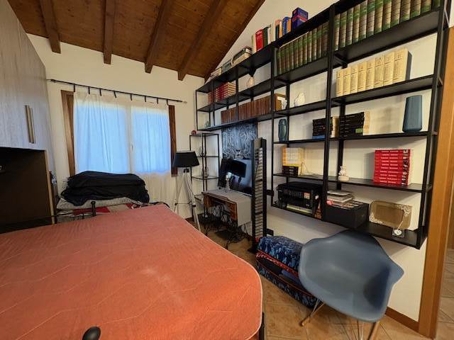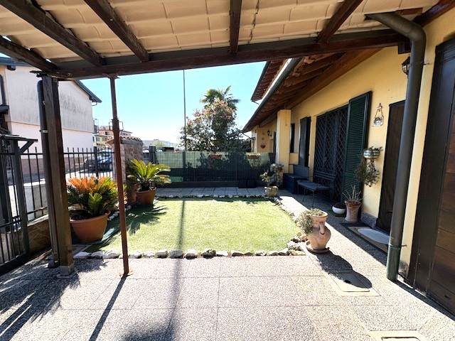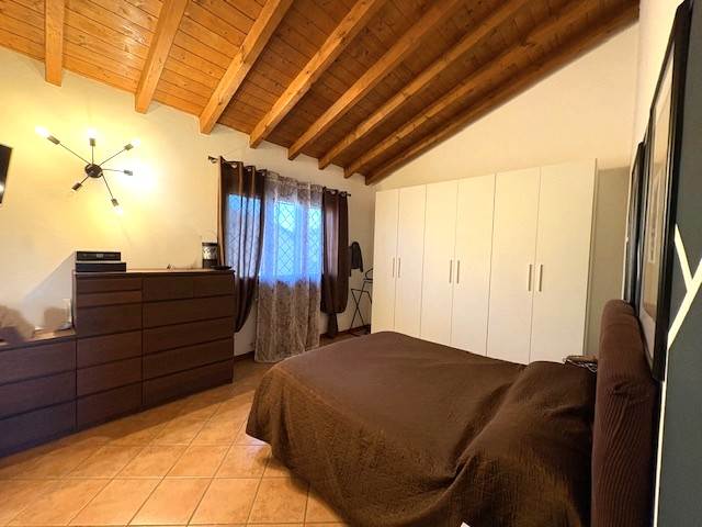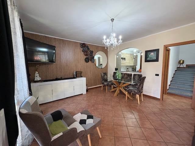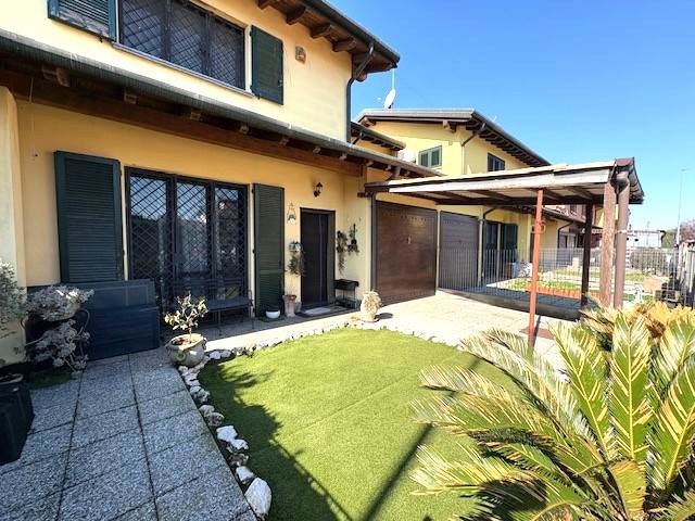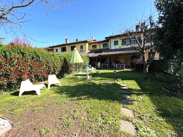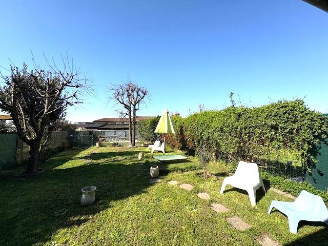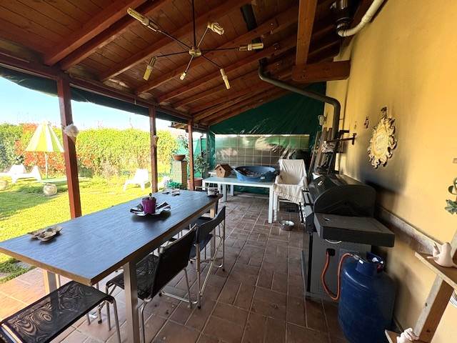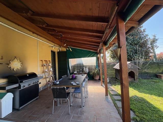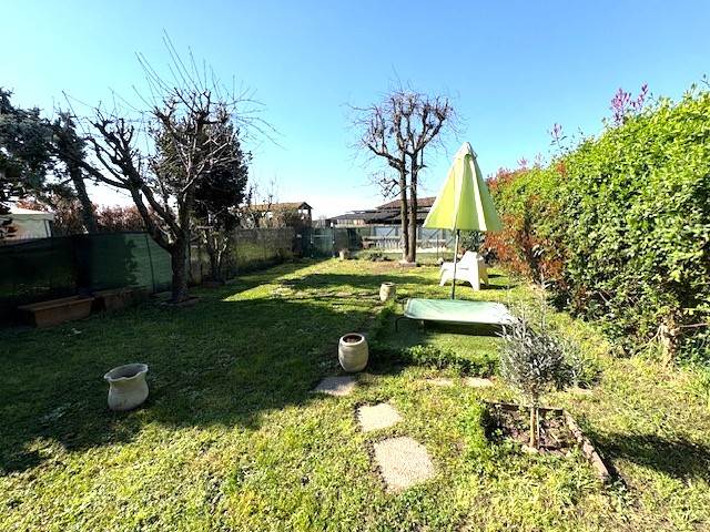 Porzione di VILLA a schiera disposta su due piani per totali mq. 110 circa: P.T.: ingresso, soggiorno, cucina abitabile, bagno, locale lavanderia, ripostiglio, ampio portico e BOX. P.1° con travi in legno a vista: disimpegno notte, due ampie camere e bagno. GIARDINO PRIVATO di mq. 290 circa.